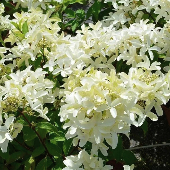 Соцветия состоят из фертильных и стерильных цветков, которые имеют большие размеры. Каждое соцветие достигает 10 см в диаметре. По форме оно больше напоминает пропеллер, так как лепестки длинные, узкие, широко поставленные. Благодаря такому расположению лепестков возникает эффект порхающих бабочек. Сами соцветия имеют белый цвет, но в конце сезона меняют свою окраску на розоватый оттенок, но не полностью. В итоге получается очень красивая бело-розовая окраска соцветия. Длина его может достигать 15 см. Цветы имеют неповторимый, тонкий аромат.Цветет с июля по сентябрь.