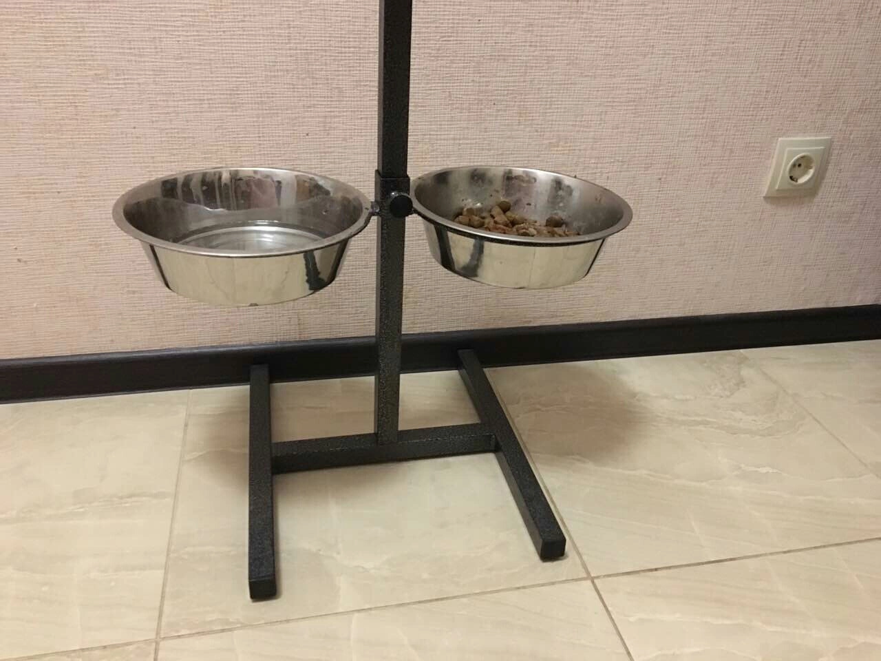 Металлическая складная кормушка с мисками для больших и средних собак всех пород. Подставка под миски выполнена из толстого листового металла.