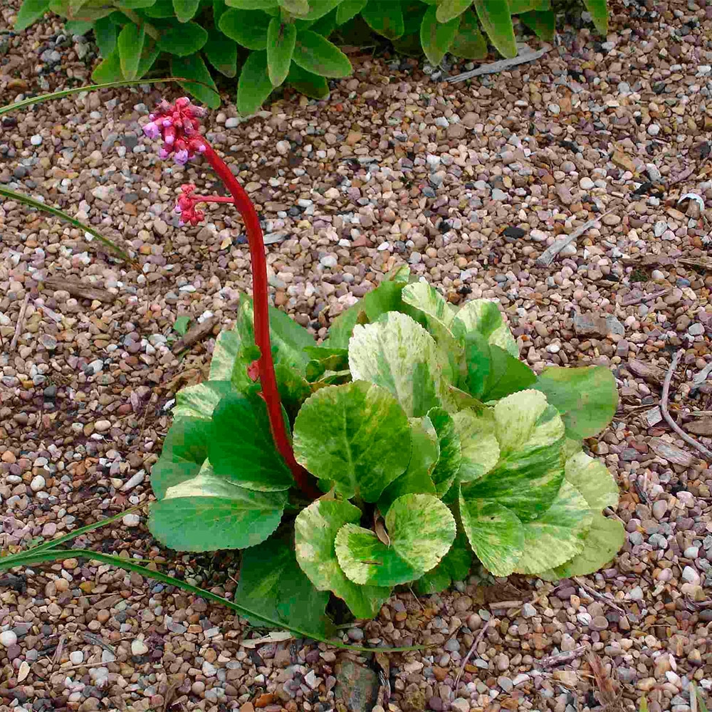 Пестролистный зимостойкий многолетник высотой 25–30 см. Листья вечнозеленые, округлые, жёсткие. Цветы — розовые колокольчики, собраны в кисть. Цветёт 25–30 дней, в апреле — мае. Растёт в полутени, тени, на солнце. Засухоустойчив, избыток влаги вреден.