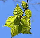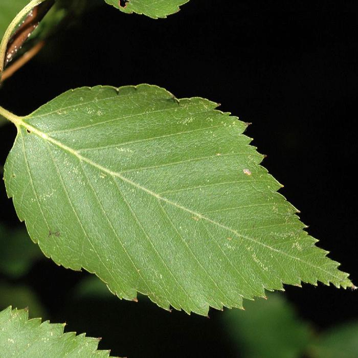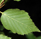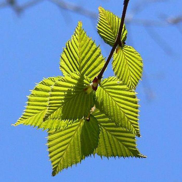 Листья яйцевидные, овальные или широко овальные, с клиновидным, округлым или слегка сердцевидным основанием и короткозаострённой верхушкой, по краю двояко-остропильчато-зубчатые, длиной 4—14 см, шириной 3—10 см, сверху тёмно-зелёные, снизу более светлые.