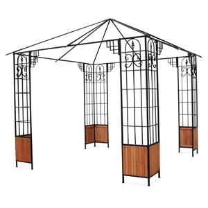 Беседка изготовлена из металла, присутствуют декоративные элементы, которые служат украшением. Беседка имеет большие размеры. Она вмещает садовую мебель, к примеру стол, скамейку или кресла.