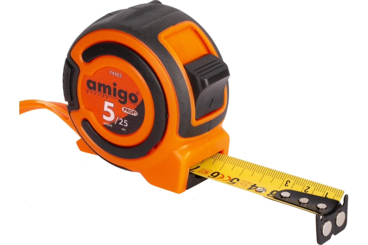Измерительная рулетка AMIGO ПРОФИ 5 м, магнитная 74102 представляет собой надежный инструмент. Профессиональная лента желтого цвета. Двухкомпонентный ударопрочный корпус. Метрическая шкала. Магнитный наконечник.