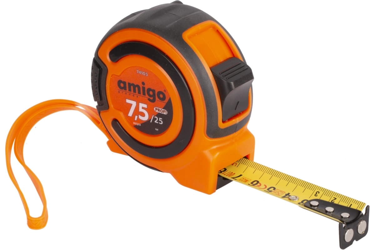 Измерительная рулетка AMIGO ПРОФИ 7.5 м, магнитная 74103 представляет собой надежный инструмент. Профессиональная лента желтого цвета. Двухкомпонентный ударопрочный корпус. Метрическая шкала. Магнитный наконечник