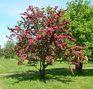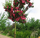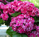 Цветет обильно в мае-июне, карминово-красные полузонтики, махровые, 1-3 столбика, яркие, пурпурно-красные, махровые до 1,5 см в диаметре.