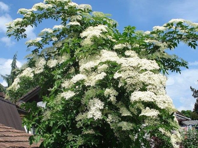 Сильнорослый прямостоячий кустарник высотой 3м, шириной 1,5м. Листья крупные. Цветки желтовато-белые, ароматные, в густых зонтиковидных соцветиях диаметром до 20 см, цветет в июне-июле, ягоды чёрные, созревают с середины сентября. Предпочитает влажные почвы и полутенистые места. Ветроустойчива. Жаро- и засухоустойчива. Переносит временное переувлажнение. Довольно устойчива к болезням и вредителям. Зимостойкая.