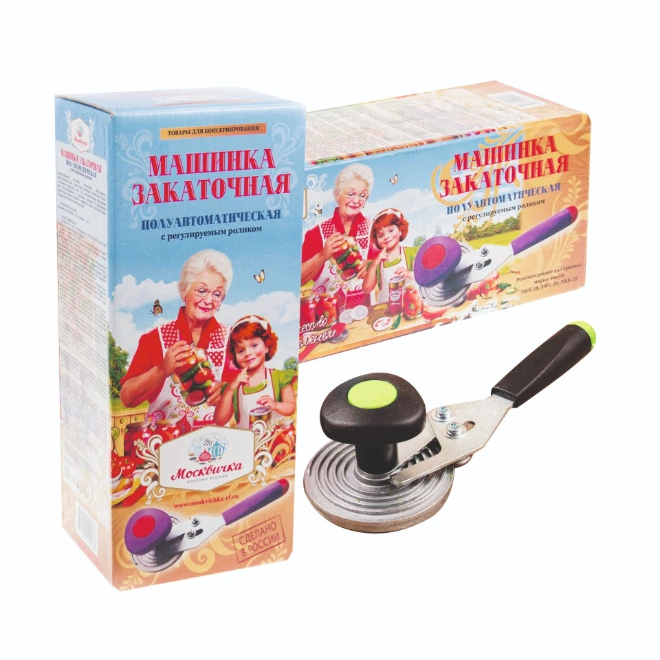 Машинка Москвичка закаточная – усовершенствованная модель закаточной машинки, разработанная для закрывания стандартных банок одноразовыми жестяными крышками. Все что необходимо-это установить данную машинку на крышке, плотно прижать и вращать рукоятку пока ролик не упрется в крышку. Используя эту машинку, даже дилетант сможет закрепить крышку надежно и ровно.