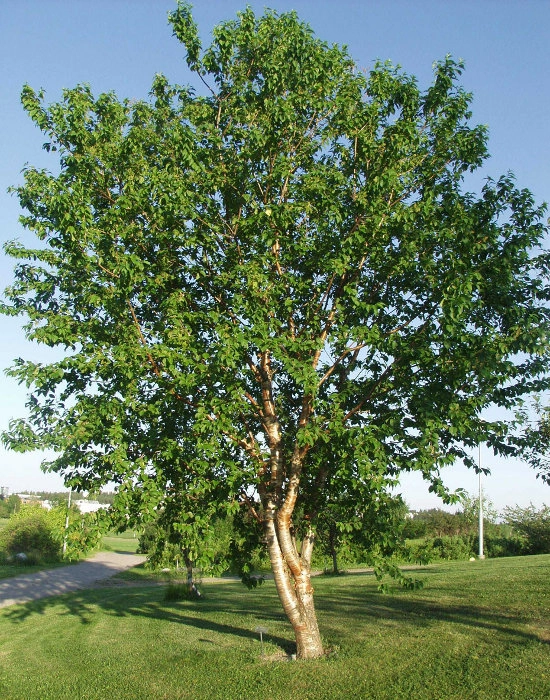 Кора блестящая, гладкая, золотисто-желтая или оранжево-красная, отслаивающаяся. Побеги прямостоячие, иногда опушённые; листорасположение очерёдное. Листья простые с острой верхушкой и зубчатыми краями, опушённые, овальной, сверху ярко-зеленые, снизу более светлые, осенью - интенсивно-желтые. Плоды черные, несъедобные.