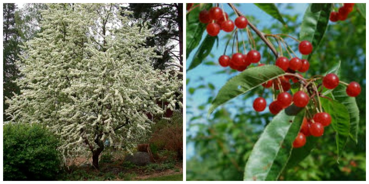 Листья от яйцевидных до продолговато-ланцетных, с оттянутой в острие вершиной и остропильчатым краем, блестящие, зеленые, до 10 см длиной, осенью окрашиваются в красные тона. Цветки белые, по 3-8 в коротких кистях. Обильно цветет и плодоносит с 3-8 лет. Плоды мелкие, красные, съедобные костянки до 0,6 см в диаметре.