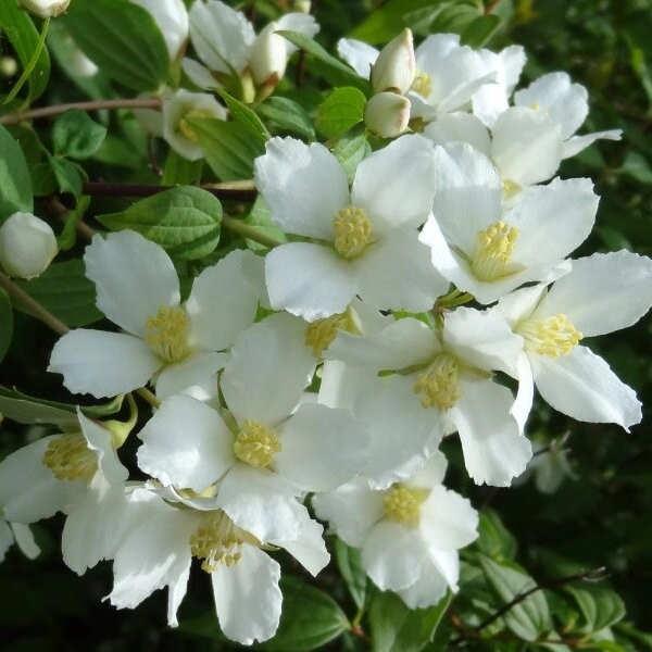 Небольшой кустарник до 1,0 – 1,5 м высотой и до 1,0 м шириной с вертикально растущими, плотно расположенными побегами, с возрастом сильно ветвистыми. Цветки простые, белые, ароматные, собраны в группы по 3 – 7 шт, многочисленные. Цветет в конце июня – начале июля. Данный сорт считается морозоустойчивым и без укрытия выдерживает температуры до -25 градусов. Растение теневыносливо, но на солнечных участках цветет лучше. Умеренно требователен к почвенным условиям. Предпочитает плодородные, дренированные, свежие, влажные, супесчаные и суглинистые почвы, с реакцией почвенной среды от слабокислой до щелочной. Не выносит застоя воды в почве и засоления. Засухоустойчив.