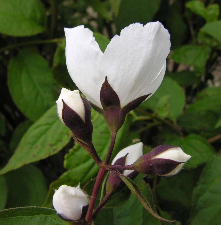 | Цветение | Цветки диаметром 5-5,5 см, белоснежные, сильно контрастируют с багрянисто-чёрной чашечкой, собраны по 3-7 в кистевидные соцветия, аромат сильный, цветёт обильно в июне-июле. |
