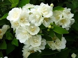 Кустарник около 1,5 м высотой, с прямостоячими побегами, цветки снежно-белые, мелкие, махровые, душистые, собраны по 5-7 в соцветия на укороченных побегах, цветет в течение 20-25 дней.Чубушник Помпон любит солнечное местоположение, в тени или полутени побеги деревца вытягиваются, так что цветение ослабевает. Плохое действие оказывают на их рост высокие грунтовые воды и застой влаги. Предпочитают чубушники почвы такого плана: листовая земля, перегной, песок (3:2:1). Дренаж состоит из щебня и песка 15 см в высоту. Для деревца укрытий на зиму не требуется..