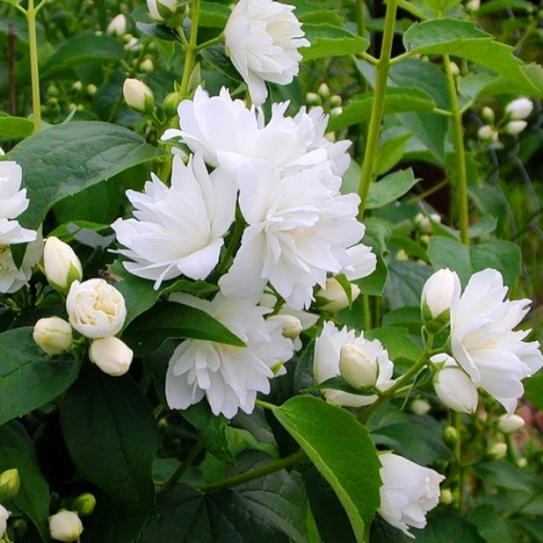 Плотный кустарник с вертикально растущими побегами до 1,5 м высотой. С возрастом крона более широкая, раскидистая, со свисающими ветвями. Цветки многочисленные, молочно – белые, густомахровые, диаметром около 3, 5 см , собраны в группы по 5 – 7 шт. Аромат деликатный. Цветет в конце весны ( июнь – июль ). Спокойно переносит морозы. Молодое растение нужно укрыть на зиму мешковиной, предварительно связав ветви. Выбирая место для высадки, остановитесь на хорошо освещенной зоне. Допускается полутень в дневное время около 3 часов, но не более того. Что касается грунта, то растение нетребовательно.
