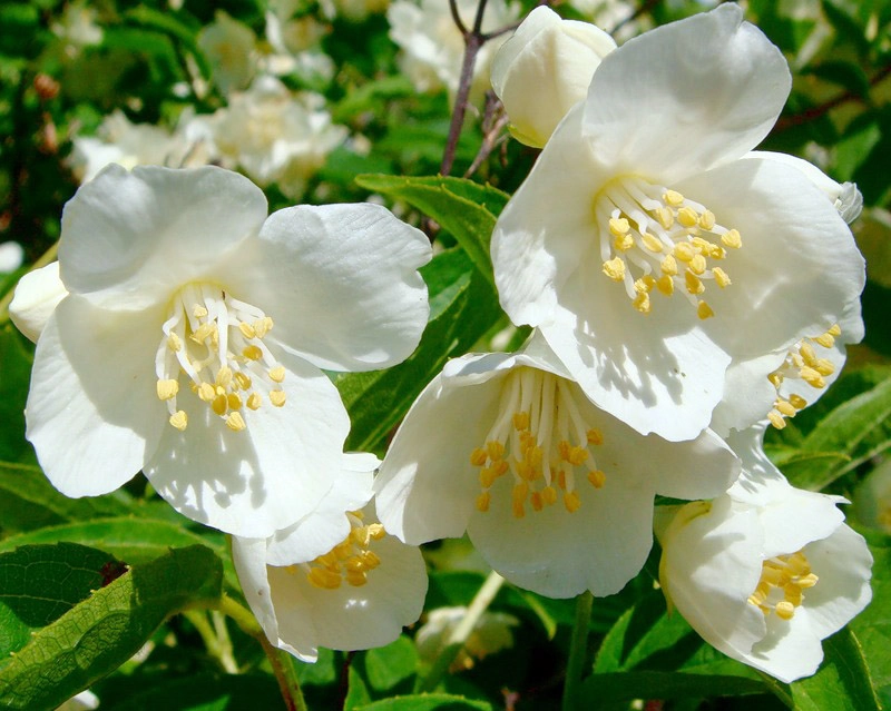 Куст высотой до 2 м, компактный. Простые, некрупные, чашеобразные, кремово-белые цветки, с красиво выделяющимися желтыми тычинками. Отличается сильным приятным ароматом. Оригинальным в этом сорте является пониклость всех цветков, напоминающих парашюты. Сорт раннего срока цветения. Пригоден для создания живой изгороди. Зимовка не составляет проблемы. Светолюбив, но может переносить легкую тень. Предпочитает плодородные свежие, хорошо дренированные, влажные, супесчаные и легкосуглинистые почвы с реакцией от слабокислой до слабощелочной, Не выносит близкого стояния грунтовых вод, переувлажнения и засоления почв. Довольно засухоустойчив.