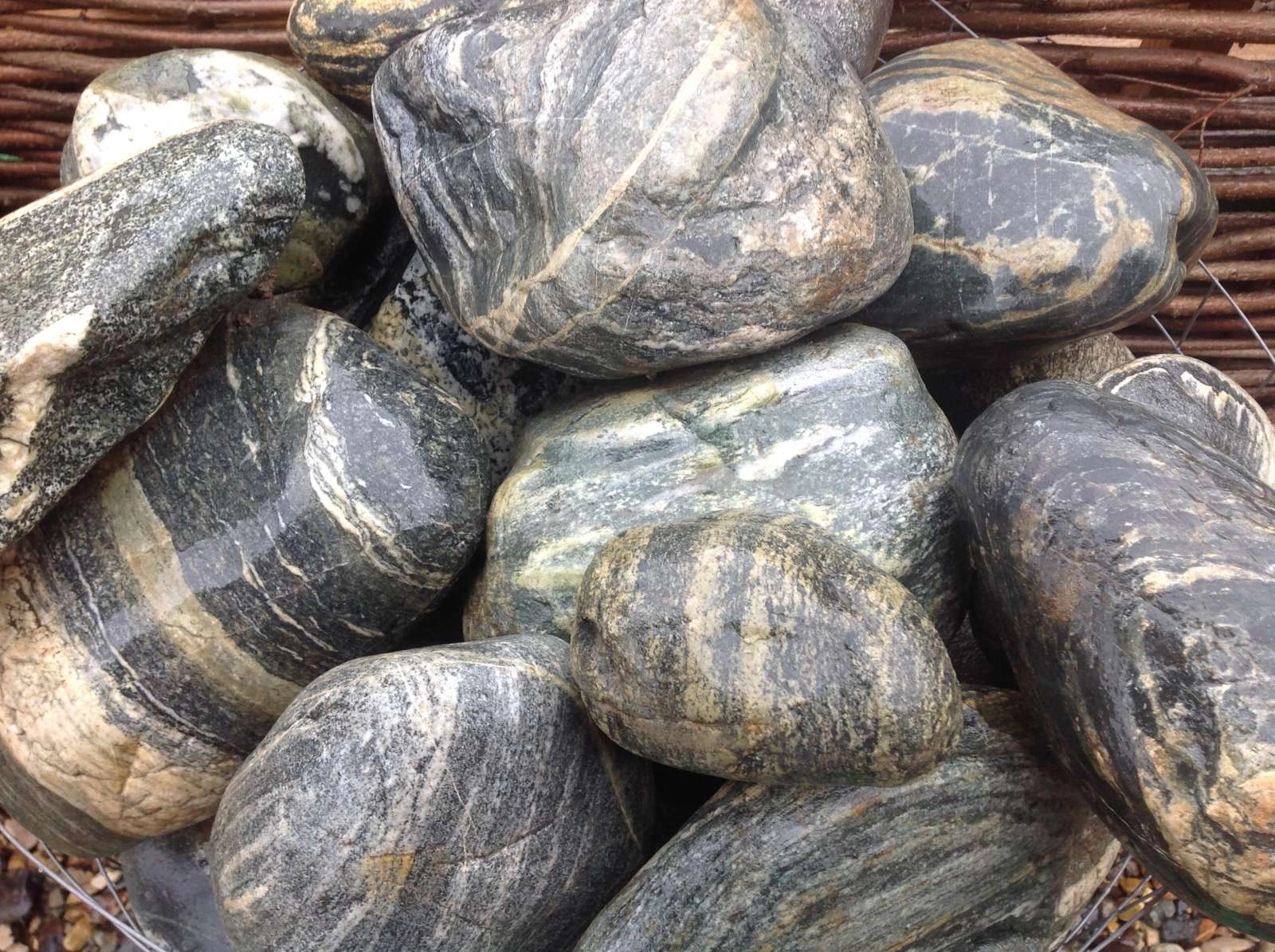 Булыжник из изверженных горных пород. Мягкий серо-голубой цвет булыжника хорошо подходит для оформления ручьев и водоемов, а общая цветовая гамма с "Черноморской" природной галькой позволяет создавать ландшафтные композиции в едином цвете.