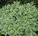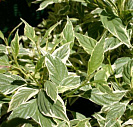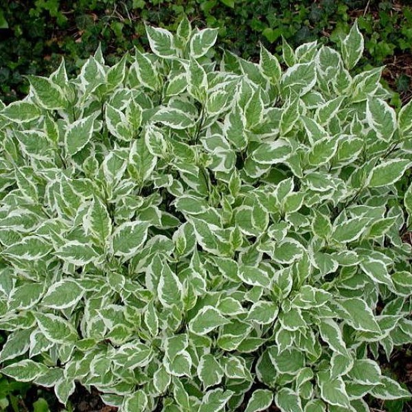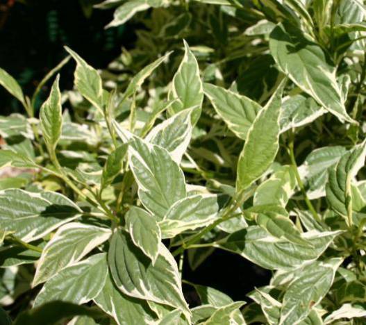 Листья широкие, лацентные, около 8 см длиной, с характерным кремовым цветом по краям, с нижней стороны опушены.
