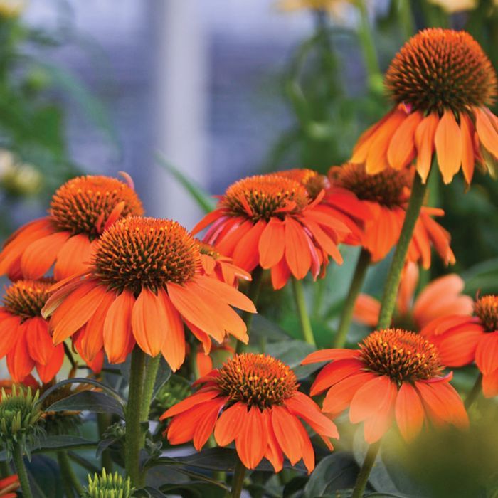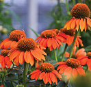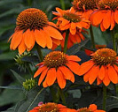 Цветки очень крупные, оранжевые, с перекрывающимися лепестками. Центр большой, конусовидный, рыже-коричневый. Цветение обильное с июля до конца сезона.