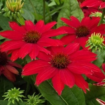 Высотой до 100 см. Листья зеленые, зубчатые, опушенные. Цветки крупные, до 12 см в диаметре, с ярко-красными язычковыми лепестками и выпуклым коричневым центром. Цветет с июля по сентябрь. Светолюбивое, к почве не требовательна. Зона морозостойкости (зимостойкость) 4 (до -35С)