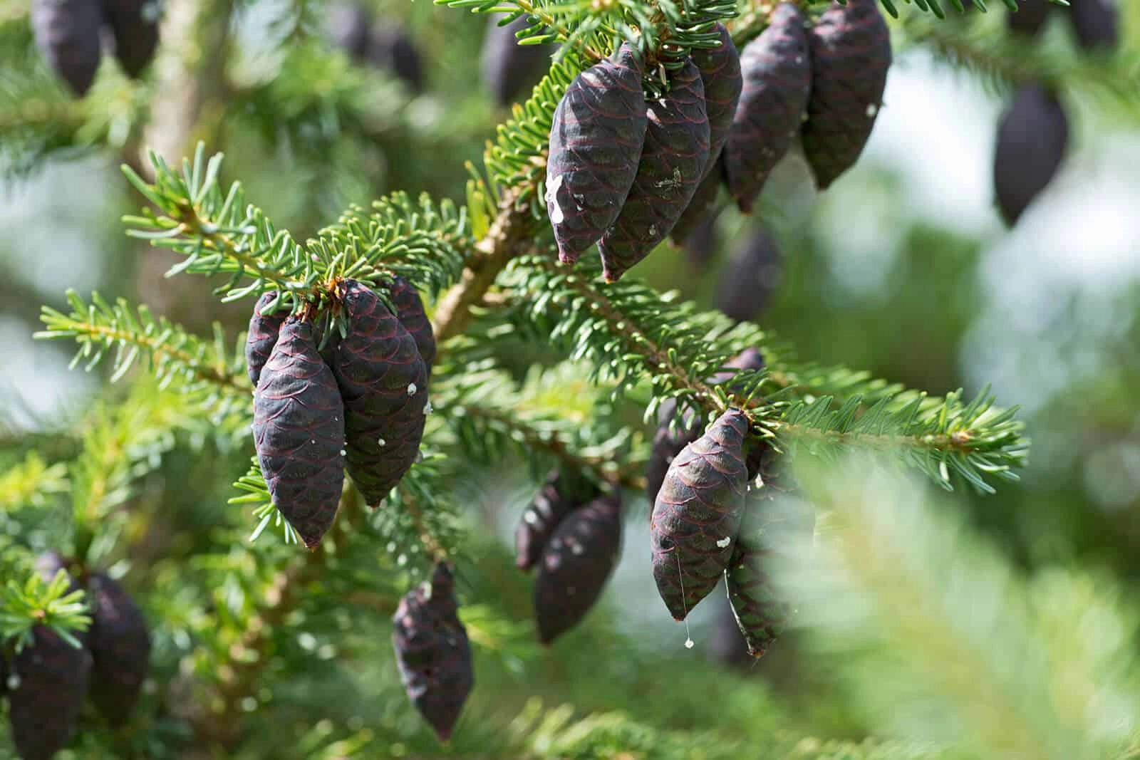 Небольшие фиолетовые или красно-коричневые шишки крепко держатся на ветках. Если их не трогать, будут украшать крону по 30 лет.