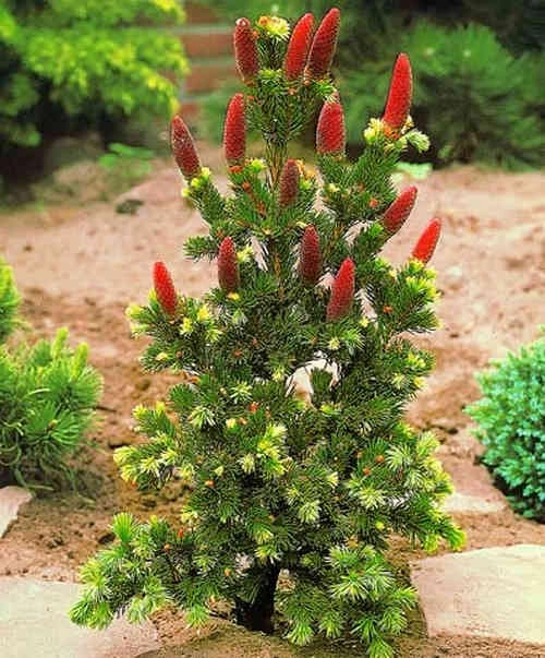 Особенность Lucky Strike – декоративные шишки, которые сперва торчащие и ярко малиново-красного света, а со временем поникают, темнеют и становятся светло-коричневыми. Плодоношение – обильное.