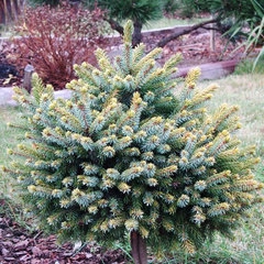 Годовой прирост в высоту – 35 см, в ширину - 15 см. Взрослое растение высотой 4,5 м, шириной 3 м. Крона стройная, плотная, правильной конической формы. Ветви густые, тонкие, плотные, короткие. Хвоя толстая, густая, блестящая, двухцветная. Сверху –зеленая, снизу – бело-голубая. Шишки коричневого цвета, длиной до 6 см.