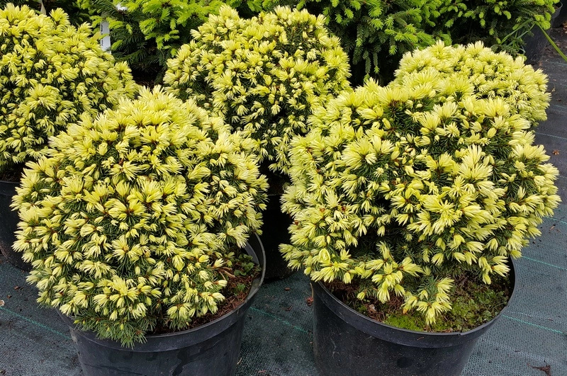 Карликовый сорт достигает 0,6-0,8 м в высоту и 1 м в ширину. Форма кроны, плотная, гнездовидная или шаровидная. Хвоя, игольчатая, 1-2 см длиной, четырёхгранная, ярко-зелёного цвета, молодые приросты светло-кремовые. Особенности роста: растёт медленно. Годовой прирост составляет 2-3 см. Почвы: предпочитает свежие или влажные, умеренно богатые питательными веществами, супесчаные и суглинистые,кислые или слабокислые. Не переносит застоя влаги, засоления и сухости почвы. Отношение к свету: светолюбива, выносит полутень. Зона морозостойкости (USDA) 4 (от -34° до -29°). От весеннего солнца желательно притенять и требуется подобрать укрытое от ветров место (сильный порыв ветра может вырвать молодое растение с корнем).