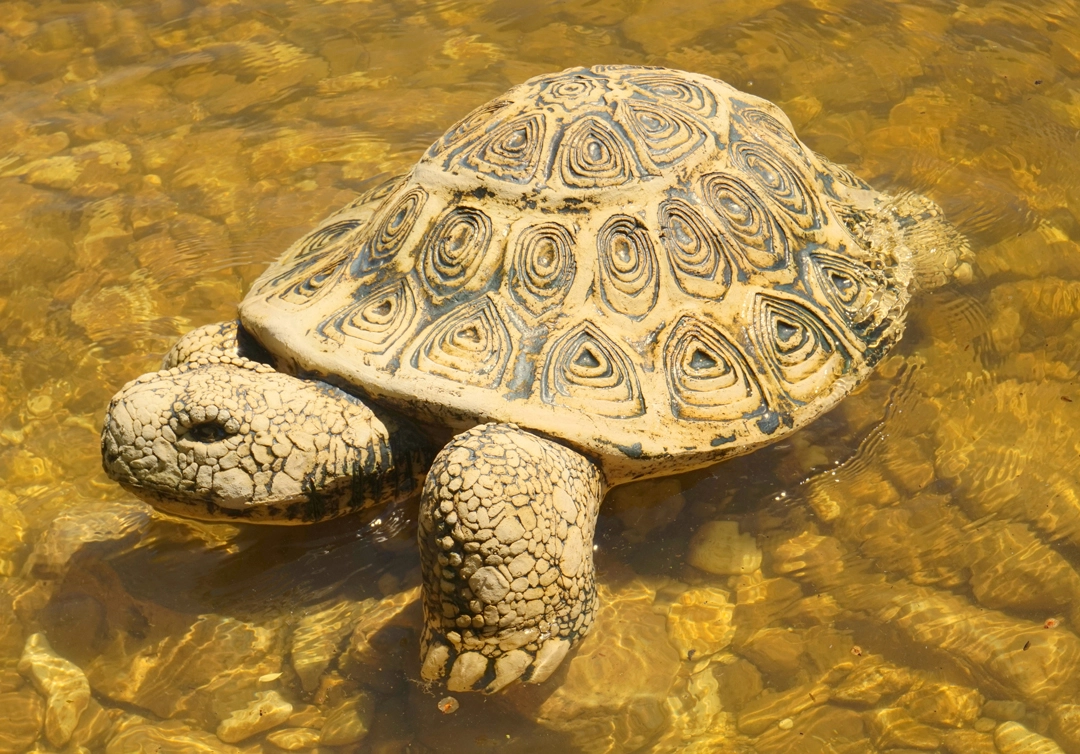 Скульптура черепахи выполнена из шамотной глины, обожжена, декорирована солями. Подчеркнута игра природных фактур, натуральная красота камня, земли, нежной травы и неба. Тонкая гармония пространства и души..