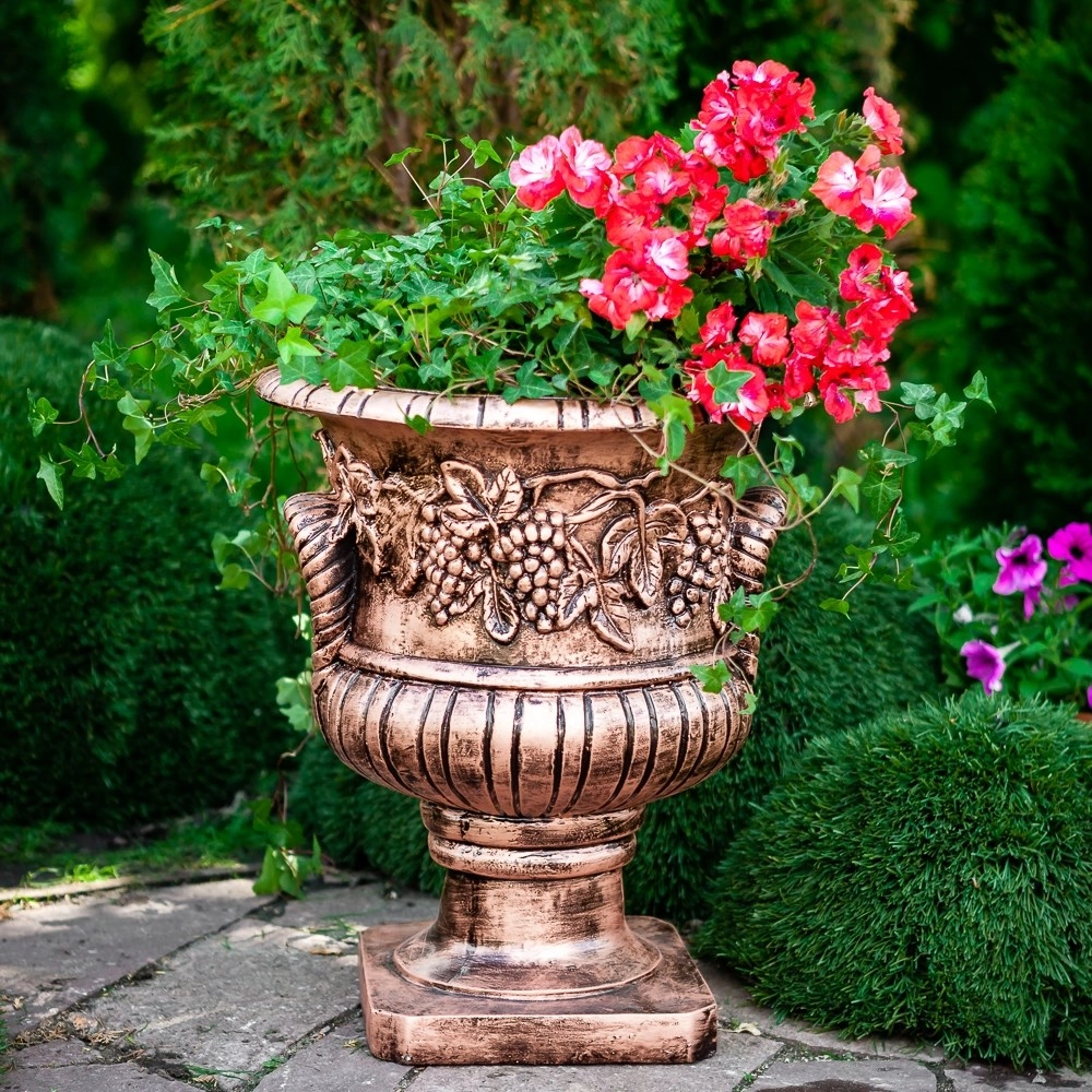 Вазон для цветов. Материал изготовления: влагостойкий стеклопластик. Предназначен для посадки цветов, декора загородных участков, парков, скверов и кафе. На уличном вазоне имеется декор в виде виноградной лозы.