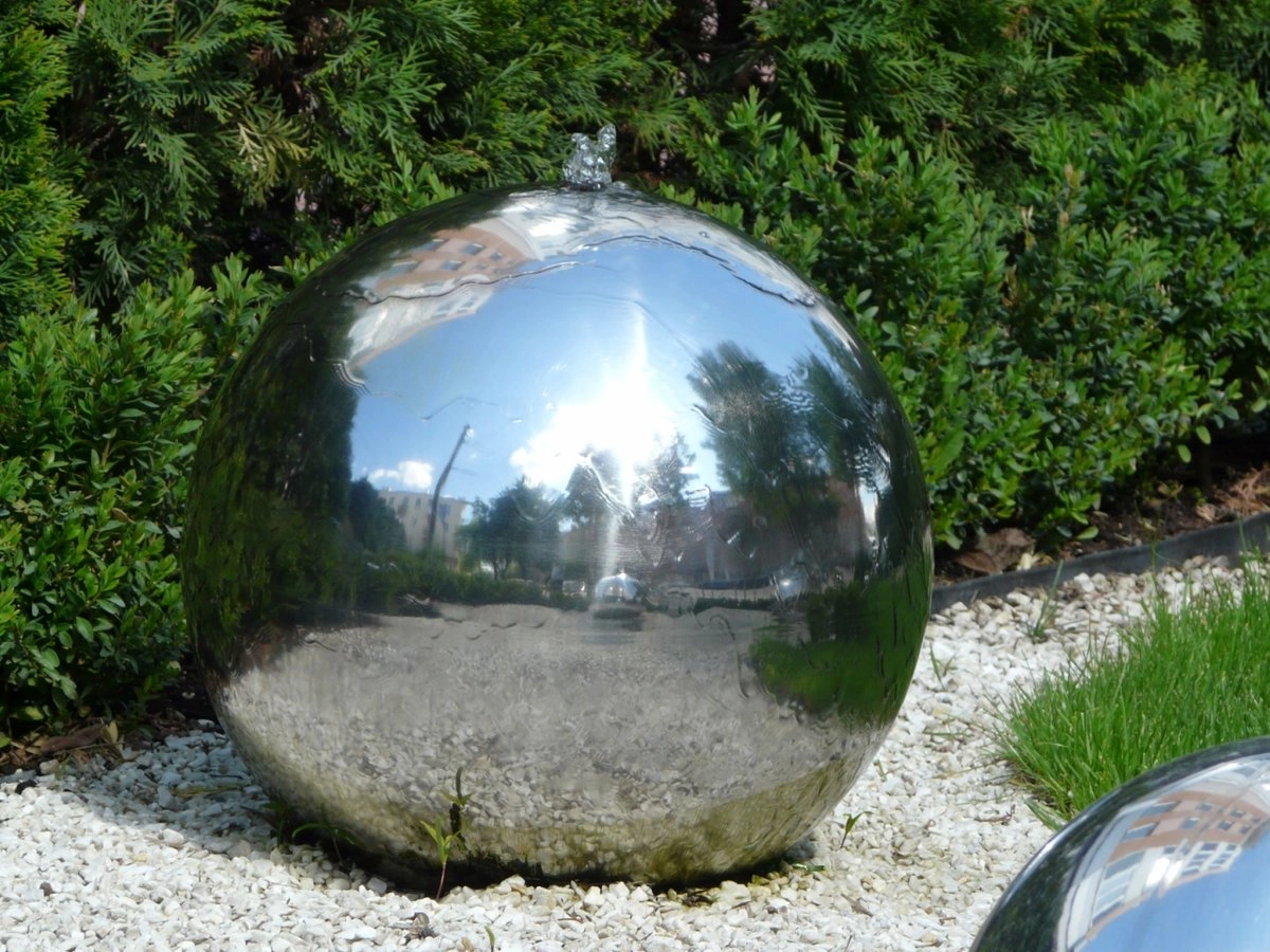 Фонтан-шар из нержавеющей стали для садового декора — современный фонтан из стали. Он может позволить себе гордо выступить одному или как на фото — в ансамбле, а можно для природного стиля дополнить фонтан -шар из стали композицией из растений и творчески декорировать землю галькой. Можно создать и иную ландшафтную историю: взять чашу для воды большего размера и, не закрывая сеткой и галькой, оставить гладь воды вокруг фонтана-стального шара и по краям берегов высадить водные растения. Фонтан-шар из стали можно разместить и в небольшом садовом пруду, он будет красиво отображать поверхность воды. Зеркальная поверхность стального фонтана в форме шара отражает ландшафт и обладает высоким декоративным эффектом не зависимо от того, включен фонтан и бежит вода, либо выключен: и в том и в другом случае сфера выглядит эффектно и современно.
