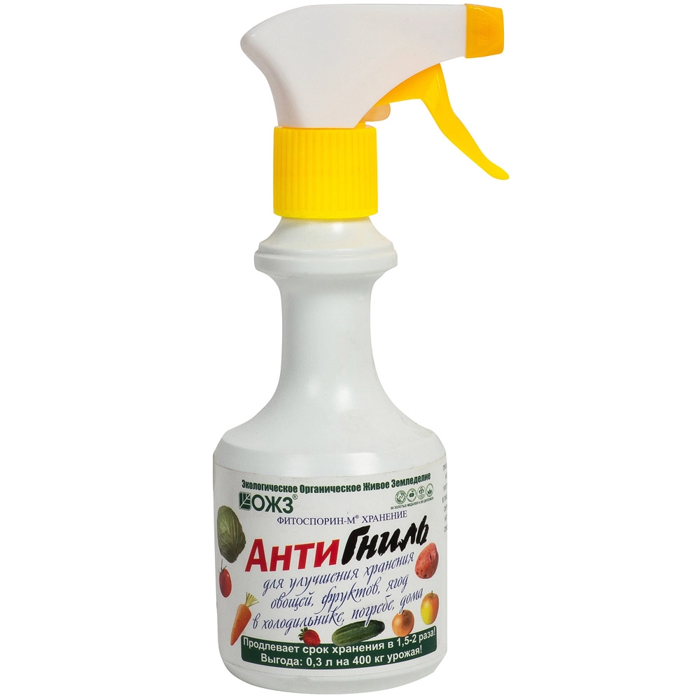 Природный биофунгицид на основе бактерий для защиты овощей, ягод и фруктов от гнилей при хранении и транспортировке. Продлевает срок хранения продуктов в 1,5–2 раза. АнтиГниль не содержит химических добавок, безопасен для человека (нет срока ожидания), вы можете употреблять в пищу овощи и фрукты даже в день обработки. Готовым рабочим раствором при помощи удобного распылителя можно сразу, не тратя времени на разведение, обработать урожай и место хранения (погреб, ящик и т.д.).