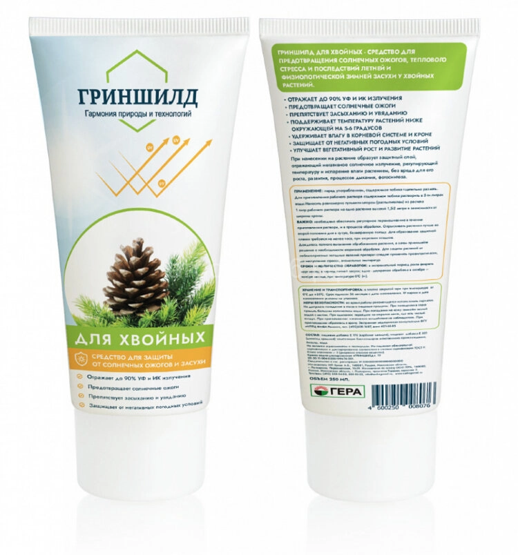 ГРИНШИЛД для хвойных - средство для предотвращения солнечных ожогов, теплового стресса и последствий летней и физиологической зимней засухи у хвойных растений.