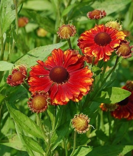Декоративный многолетник высотой до 75 см. Листья сидячие, продолговато-ланцетные с мелкозубчатым краем. Цветы оранжево-красные, с коричневым центром и жёлтыми полосами на краях лепестков. Цветёт с середины июля. Цветы - корзинки до 3 см диаметром. Не выносит пересыхания почвы. Светолюбив. Зимостоек.