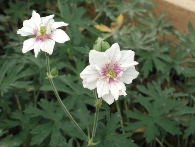 Цветки уникальные, махровые, белые с красивыми пурпурными мазками у основания лепестков. Листья лопастные, тёмно-зелёные, высотой 25 см. Цветоносы высотой 40 см. Цветение в июне-августе. Место солнечное. Зона 5 (до -23ºС). На зиму рекомендуется укрывать.