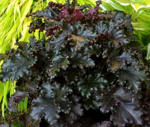 Гейхера с большими шелковистыми, блестящими коричневыми и почти черными кучерявыми листьями. Соцветия розовые и розово-белые.