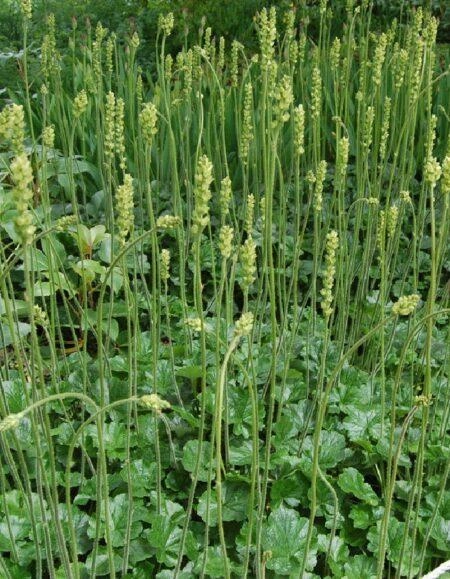 Декоративнолиственное компактное растение, цветоносы с кремовыми ажурными цветами могут достигать 90 см. Листья зеленые волнистые, с выделенными пурпурными прожилками. Цветение в июле-августе. Может расти на солнце и в полутени. . Стабильно декоративна благодаря зимующим листьям.