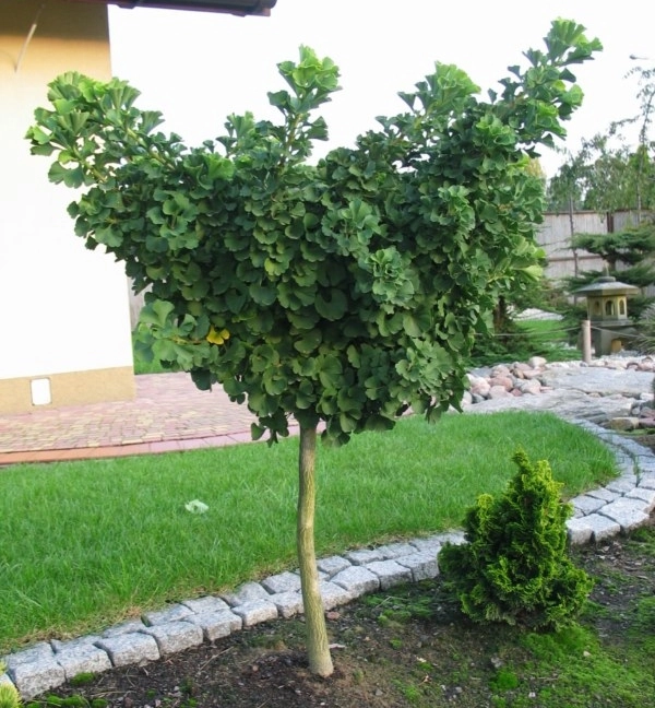Форма листьев необычная – веерообразная. После цветения, формируются завязи с плодами в виде желтых шариков.