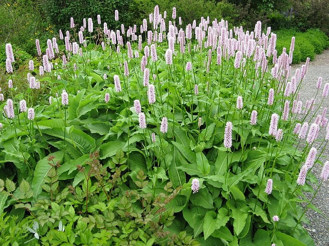 Высота 60-100 см. Цветки мелкие розовые, собраны в длинные, достаточно крупные колосовидные соцветия, цветение в июне. Цветы зеленые, ланцетовидные, прикорневые листья купные, до 30 см длиной, на длинных черешках, выше по стеблю более мелкие на коротких черешках. Неприхотлив, но предпочитает суглинистые, достаточно влажные почвы, можно высаживать по берегам водоемов, зимостоек.