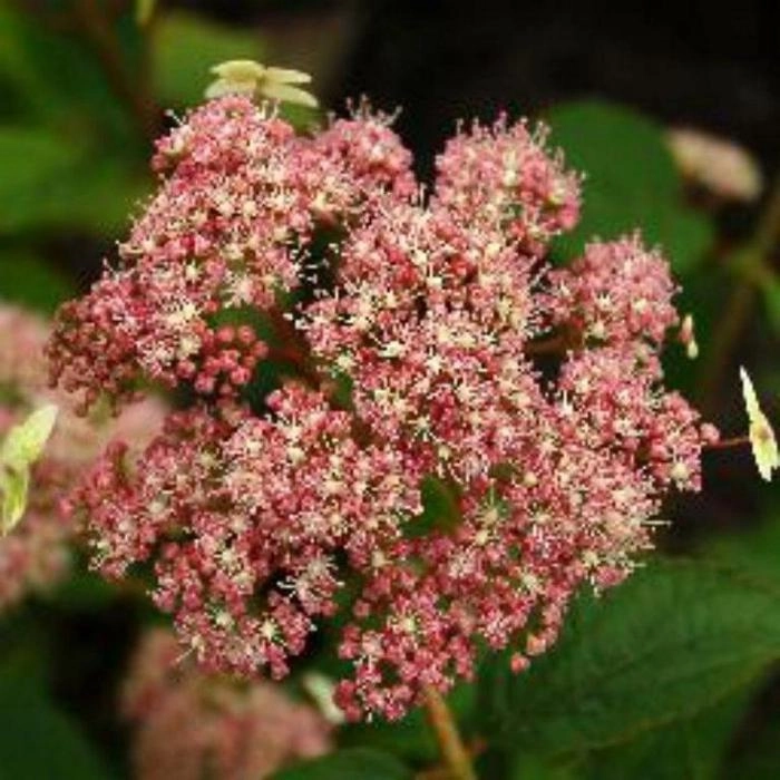 Бутоны розовые. Цветки в основном плодоносящие, от розовато-белых до белых. Куст высотой 100-120 см, шириной 150 см. Соцветия плоские, слегка куполообразные, диаметром 10 см. Цветёт в июне-августе. Для солнечных и полутенистых мест. Гортензия может легко переносить температуру в -27°.