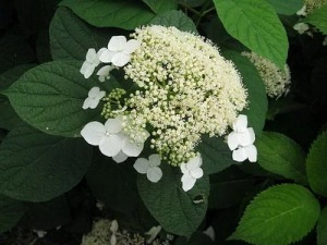 | Цветение | Цветет обильно в июне-сентябре на верхушках приростов текущего года. Соцветия многочисленные, крупные, диаметром до 25 см, слегка выпуклые щитковидные. Плодущие цветки кремовато-белые, а краевые стерильные цветки белоснежные до 2 см в диаметре. |
