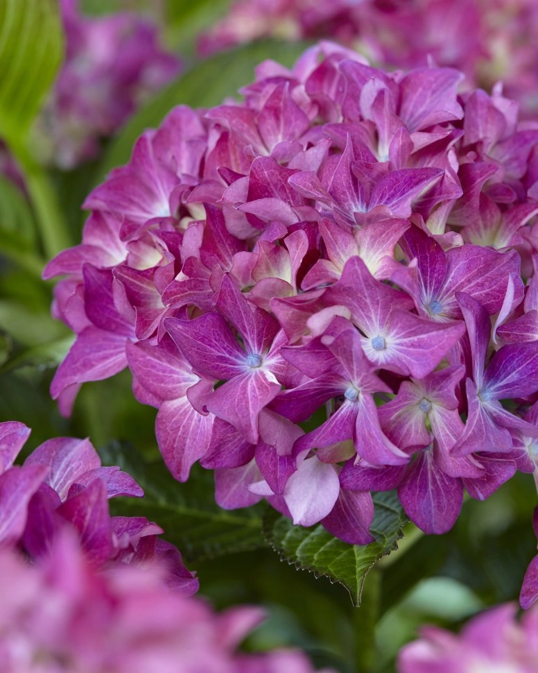 Куст пышный с крупными зелеными листьями высотой до 90см. Уникальный цветок, с удивительной и неповторимой расцветкой. Нежные розовые лепестки цветка постепенно переходят в пурпурный цвет. Интенсивность и оттенки этой гортензии зависят от стадии роспуска, кислотности почвы, освещенности и других факторов. Морозостойкость: не очень высокая до (-23 ° C). Поэтому требует укрытия на зиму, чтобы не померзли почки цветов.