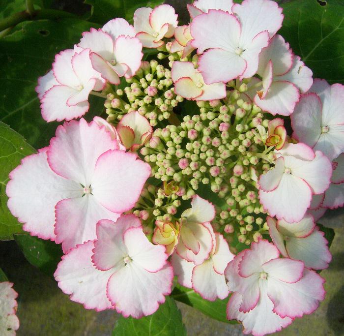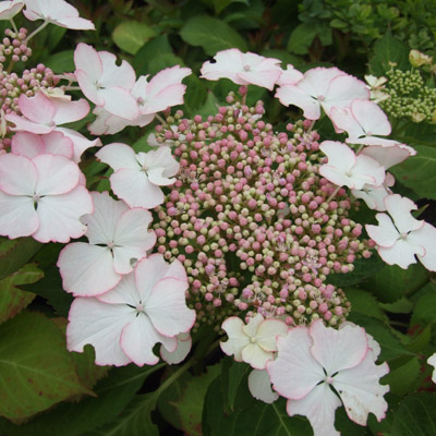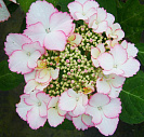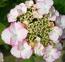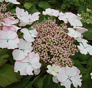 Соцветия плоские, со смешанными цветами, бело-розовые. Цветет в июле-августе. Цветение на побегах текущего года, за счет чего даже при подмерзании побегов гортензия будет цвести.