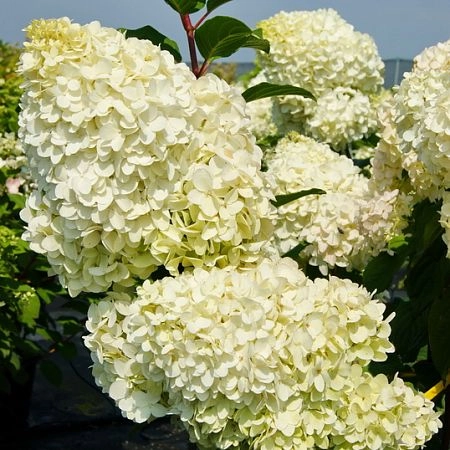 Этот сорт особенно интересен плотностью куста и обилием цветов. Куст имеет вертикальную, слегка расклешенную форму, средней высоты, не более 1,2 м. Побеги прямые, довольно жесткие, сорт не требует подвязки. Соцветия среднего размера: 20-25 см, очень плотные, густые метелки, состоящие из стерильных цветков. Отличается от других сортов метельчатой гортензии тем, что ее соцветия обладают сильно закругленной формой. В начале цветения сорт имеет удивительную желто-зеленую и золотистую окраску, затем чисто белую и к концу цветения лепестки окрашиваются в светло-розовый цвет. Цветение с июня до сентября.