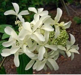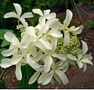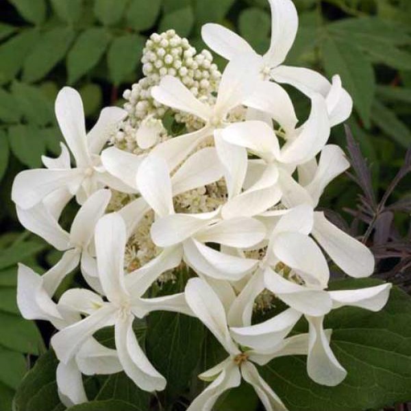 Имеет чисто-белые округлые соцветия. Стерильные цветки имеют необычную волнистую форму с длинными, похожими на пропеллер лепестками. Диаметр цветка может достигать 8см, для гортензии – явление невероятное. Время цветения: июль-сентябрь.