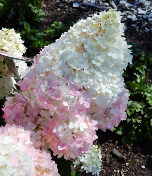 С середины лета на кусте появляются очень крупные, конические зеленоватые соцветия с преобладанием крпупных стерильных цветков, затем они становятся белые и постепенно розовеют снизу вверх.