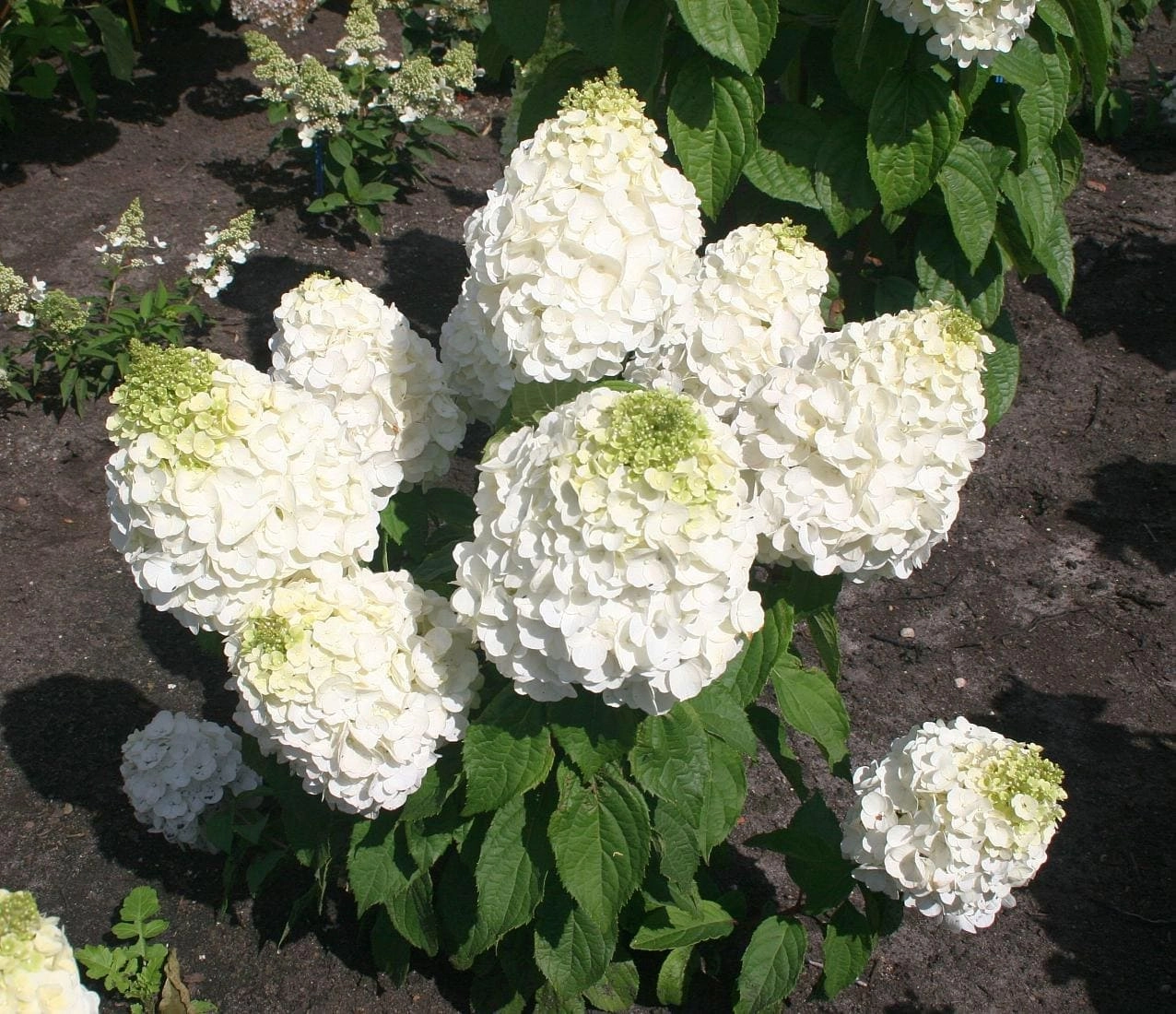 Гортензия метельчатая Мэджикал Монблан. Превосходный сорт из серии Magical. Куст ровный, компактный, побеги все одной длины (взрослое растение — 150 см). Соцветия широко-пирамидальные, остроконечные, состоят из крупных стерильных цветков. Цветки в нижней части соцветия белоснежные, в верхней зеленые, по мере взросления в нижней части кремовые, в верхней — белоснежные. Способна украсить полутенистые сыроватые места. Для посадки гортензии выбирают либо солнечное, либо полутенистое место. Гортензии нуждаются в достаточной влажности, Почва должна быть очень плодородной, влажной, отлично дренированной, с кислой реакцией. Лучшие почвы – суглинки. Но можно посадить цветок и в песчаную почву, только в ней его придется чаще поливать. На зиму требуется укрытие.