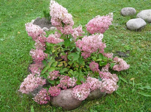 Имеет широко-раскидистый, веерообразной формы куст высотой до 2,5 м. Побеги неразветвленные, прямые, ярко-коричневого цвета, к осени снизу становятся вишневыми. Лист крупный, сверху зеленый, матовый, слегка шершавый, снизу более светлый. Форма листа широко-овальная, с заостренным кончиком, с волнисто-пильчатым краем, который слегка приподнят вверх и лист напоминает форму «лодочки». Соцветие узкоконическое, 30-40 см высотой. Цветки стерильные и фертильные. Плодушки собраны в небольшие зонтиковидные соцветия, и , некоторые из них имеют один, реже два, стерильных цветка на длинной цветоножке. Стерильных цветков немного, они довольно крупные состоят из 4-х чашелистиков, веерообразной формы и сильно выраженными зубчатыми краями. Обладает достаточно сильным нежным ароматом.