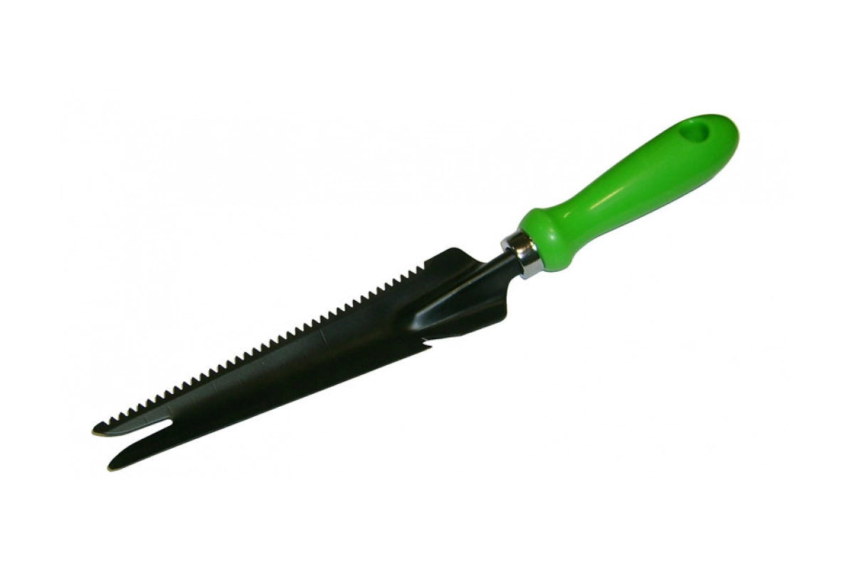 Удалитель сорняков - совок узкий универсальный 310 мм HCS сталь тефлон с пластиковой ручкой выполнен из высокоуглеродистой стали HCS, имеет антикоррозийное тефлоновое покрытие, шкалу глубины 10 см, удобную пластиковую зеленую ручку. Ручка расположена под углом 30 градусов к основанию совка, имеет отверстие для подвеса и шнурок. Корнеудалитель очень простое и удобное в работе приспособление, которое помогает садоводу легко избавиться от нежелательных сорняков, в том числе одуванчиков, на грядке, клумбе, цветнике без трудоёмкого перекапывания земли. Проникающее на 19,5 см лезвие ножа захватывает корень сорняка, после чего он вытаскивается из земли. Дополнительное удобство в работе с тяжелым грунтом и дерном дают заточенные края лезвия - нож и пила. Удалитель сорняков совмещает в себе 6 функций (6 в 1): совок, нож, пила, открывашка, корнеудалитель, глубиномер. Нож - совок так же подходит для рыхления земли, подготовки лунок для рассады и т.п.