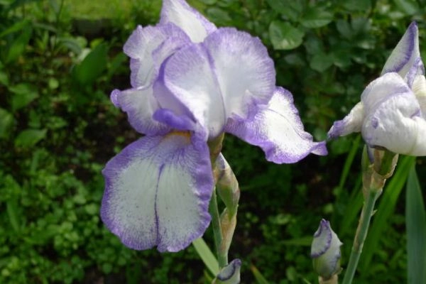 Белый с широкой голубой каймой, мощный ретро-сорт с крупными цветами. Белые с голубым окаймлением, бородка мандариново-голубая.