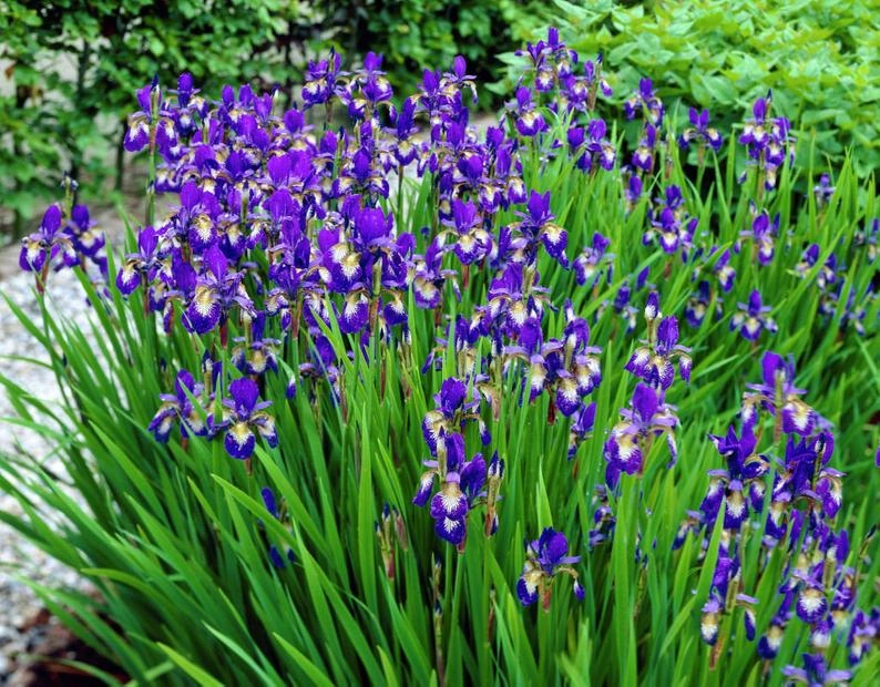Высота 60-80 см. Стебель вверху разветвленный, с 2-3 стеблеобъемлющими листьями. Прикорневые листья линейные, до 50-80 см дл. Цветки темно-синие реже голубые с белым. Наружные доли околоцветника. так же как и внутренние, синие, с бледно-синим ноготком.
