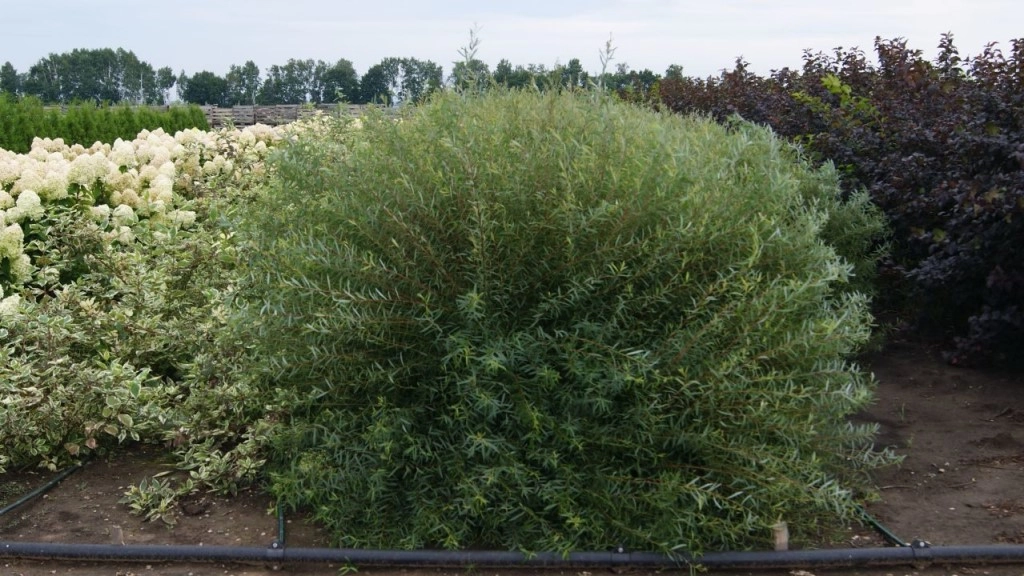 Крона густая шаровидная. Тонкие побеги пурпурного тона. Листья серебристые и достигают длины до 10 см при ширине до 1 см. Сережки этого растения крупные и окрашены в пурпурный цвет.