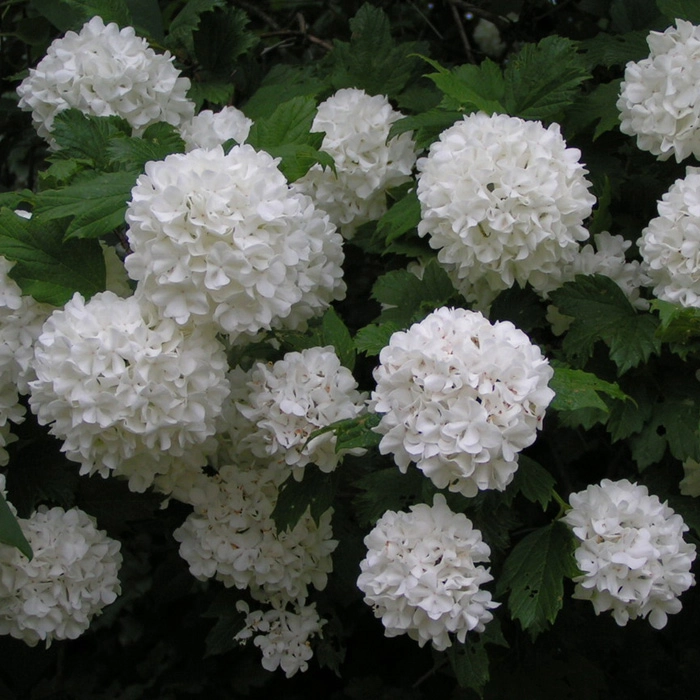 До 3-4 м высоты и ширины. Цветет обильно, крупными шаровидными соцветиями, зеленовато-белыми или белыми. Плодов не дает. Розеум вполне переносит полутень, но удивительно то, что если растет в затененных местах, теряет свои краски и цветет плохо. Примечательно и очень удобно, то кустарник стойко переносит зиму, вплоть до минус 34-градусного мороза.